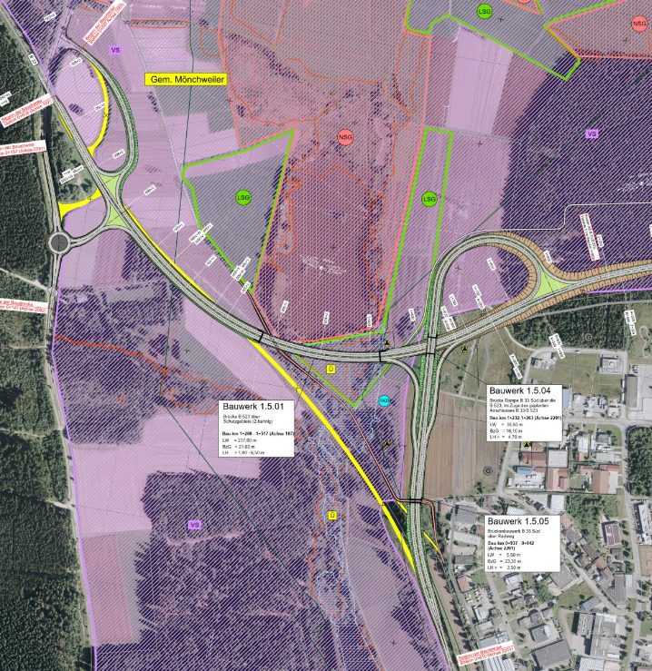 (Anmerkung: „untergeordnet“ heißt nichts anderes als lichtsignalgesteuerte Knotenpunkte B523/B33 West und Ost – Staus sind vorprogrammiert.)