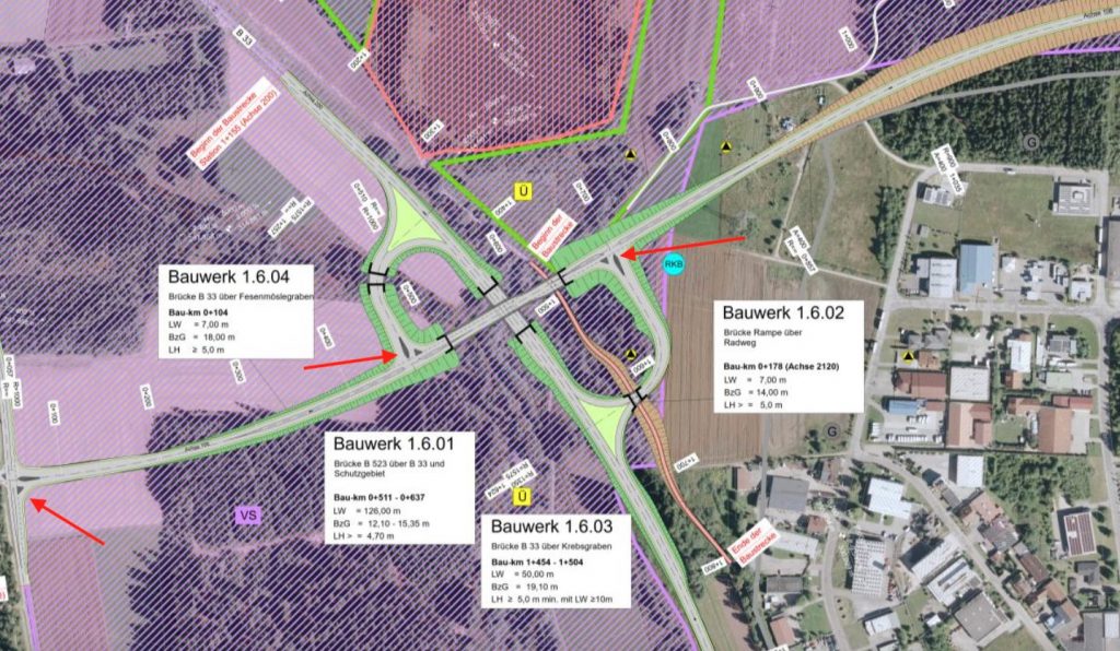 ➣ Die neue B523 wird „untergeordnet über ein sogenanntes halbes Kleeblatt an die B33“ angeschlossen (Variante 6.2).